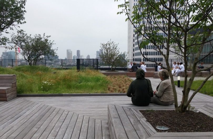 Het meest opzienbarend in het nieuwe 'groene' ziekenhuis zijn de twee daktuinen op de achtste verdieping, op deze hoogte de grootste van Nederland. Hier kunnen personeel, bezoekers en zelfs bedlegerige patiënten genieten van de zon, weelderig groen, fruitbomen en de skyline van Rotterdam.