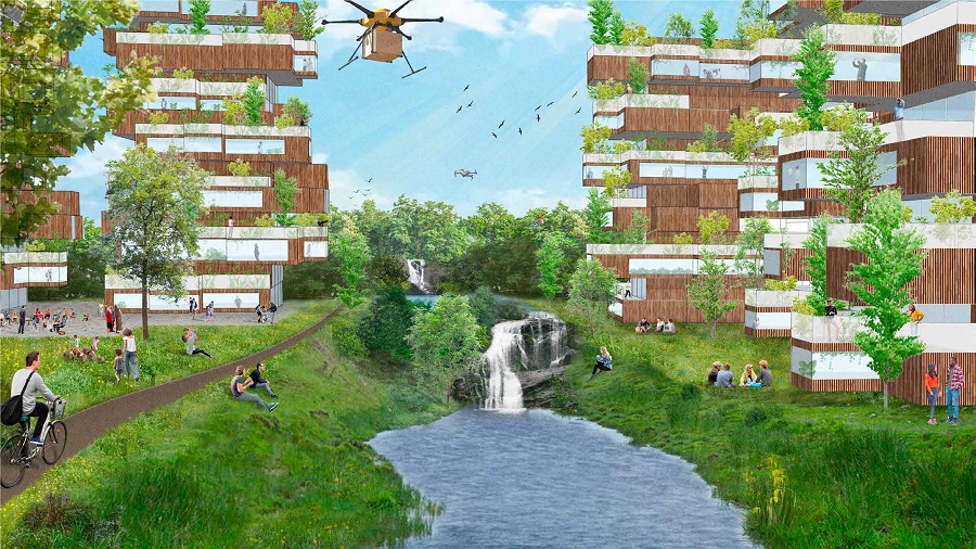 Stel, je maakt in het jaar 2120 een fietstocht in en rondom de stad Arnhem, dan fiets je eigenlijk door drie landschappen heen. In het noorden vind je de Veluwe, waar mensen wonen in het groen. Je komt houtzagerijen tegen, waar we materialen maken om huizen mee te bouwen. Nieuwe meren zijn aangelegd voor energieopslag. Op de flanken van de Veluwe ontmoeten de nieuwe stad, de historische stad en de natuur elkaar. Wandel langs een van de brede sprengenbeken, pak een terrasje, of neem een duik bij de watervallen. Een frisse wind waait tussen de door groen bedekte gebouwen heen. Meer verkoeling is te vinden in het rivierengebied. Dit landschap verandert het hele jaar door en deint mee met de standen van het water. Bij hoog water vaar je met je fiets via een bootje naar je drijvende woning.