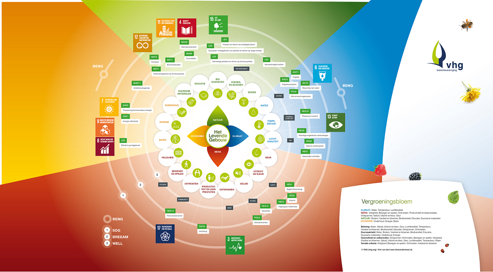 In opdracht van de branchevereniging VHG is de handleiding Het Levende Gebouw ontwikkeld. De handleiding bevat vierhonderd gerealiseerde praktijkvoorbeelden van levende groene gebouwen, handig geordend en gebaseerd op wetenschappelijk onderzoek en gebruikerservaringen. Voor elk type gebruiksfunctie (wonen, werken, zorg, leren, mobiliteit & logistiek, retail & leisure) is er een mindmap: een compleet overzicht met groene mogelijkheden voor in gesprekken en in de ontwerpfase. Ook komen succes- en faalfactoren in aanleg, gebruik en onderhoud aan bod. De handleiding is digitaal in te zien en te bestellen op de Kennisbank van de VHG.