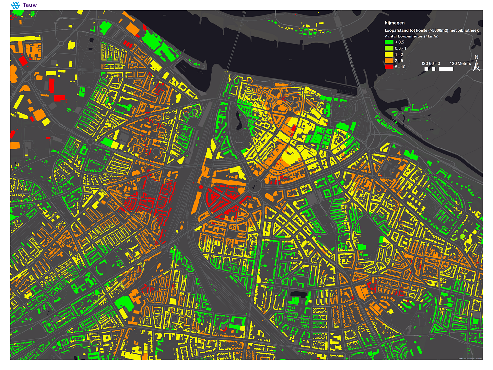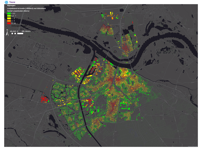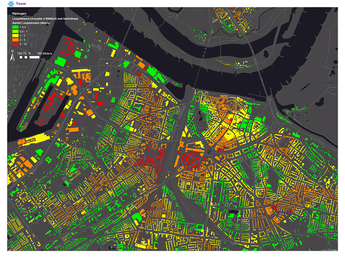Looptijd-tot-koelte kaart van Nijmegen centrum. Copyright: Tauw