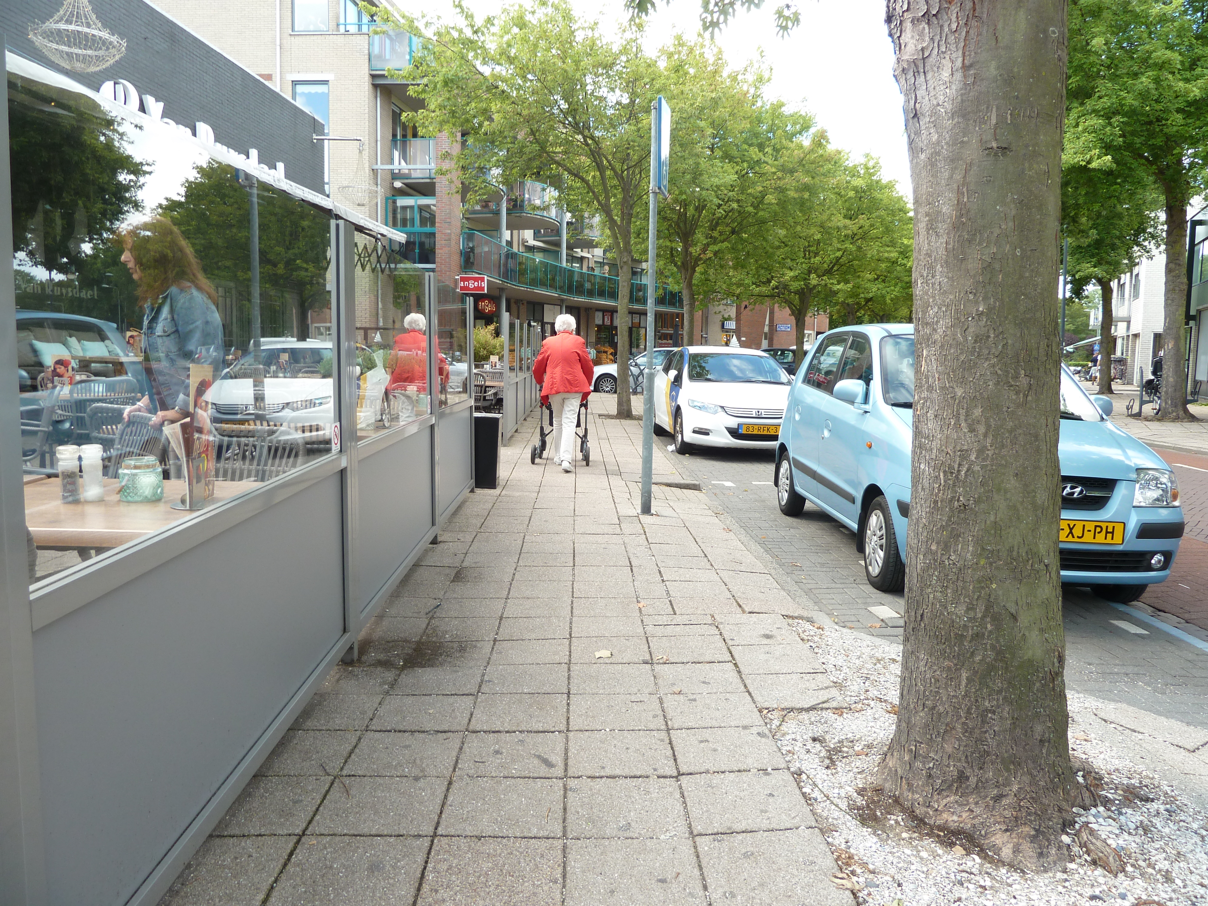 Is het pad smaller dan die 120 cm, dan is dat geen probleem als door die versmalling nog een pad van 90 cm overblijft. We gaan er dan bovendien vanuit dat die versmalling slechts enkele (3-5) meters lang is. Bij een terras dat zich over de gehele gevel van een pand uitstrekt, kan het gaan om veel meer meters en is het dus van belang om hieraan aandacht te besteden en andere maatregelen te nemen. Zo ziet u op de foto's hiernaast dat de dame met haar rollator rustig kan doorlopen, omdat het terras is afgeschermd met een afscheiding. Die zorgt ervoor dat het terras zich door het verschuiven van tafels en stoelen niet ongebreideld uitbreidt en het trottoir ruim 120 cm breed is en een veilige breedte van 90cm houdt ter plaatse van de toegang (tussen zwarte box en het paaltje van het verkeersbord). Een prima oplossing.