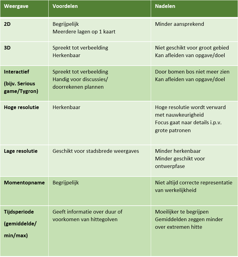 Het tijdsinterval dat een kaart weergeeft heeft ook veel invloed op de effectiviteit van de kaart. Het is mogelijk een kaart te tonen van bijvoorbeeld gemiddelde temperaturen van een periode of juist te kiezen voor een momentopname. Momentopnames spreken vaak meer tot de verbeelding, omdat dit begrijpelijker is. Sommige gemeentes gebruiken om die reden bijvoorbeeld kaarten met metingen van gevoelstemperaturen op basis van een fietstocht door de stad om hun bestuurders te overtuigen van het hitteprobleem. Die metingen spreken aan, ondanks dat de metingen zelf weinig informatie geven over hoe vaak dit voor zou kunnen komen. Daarvoor heb je toch echt een model nodig. In het geval van hitte werken gemiddelden overigens vaak minder goed omdat het juist om de extreme temperaturen gaat: dan ervaren mens en natuur immers de nadelige gevolgen.