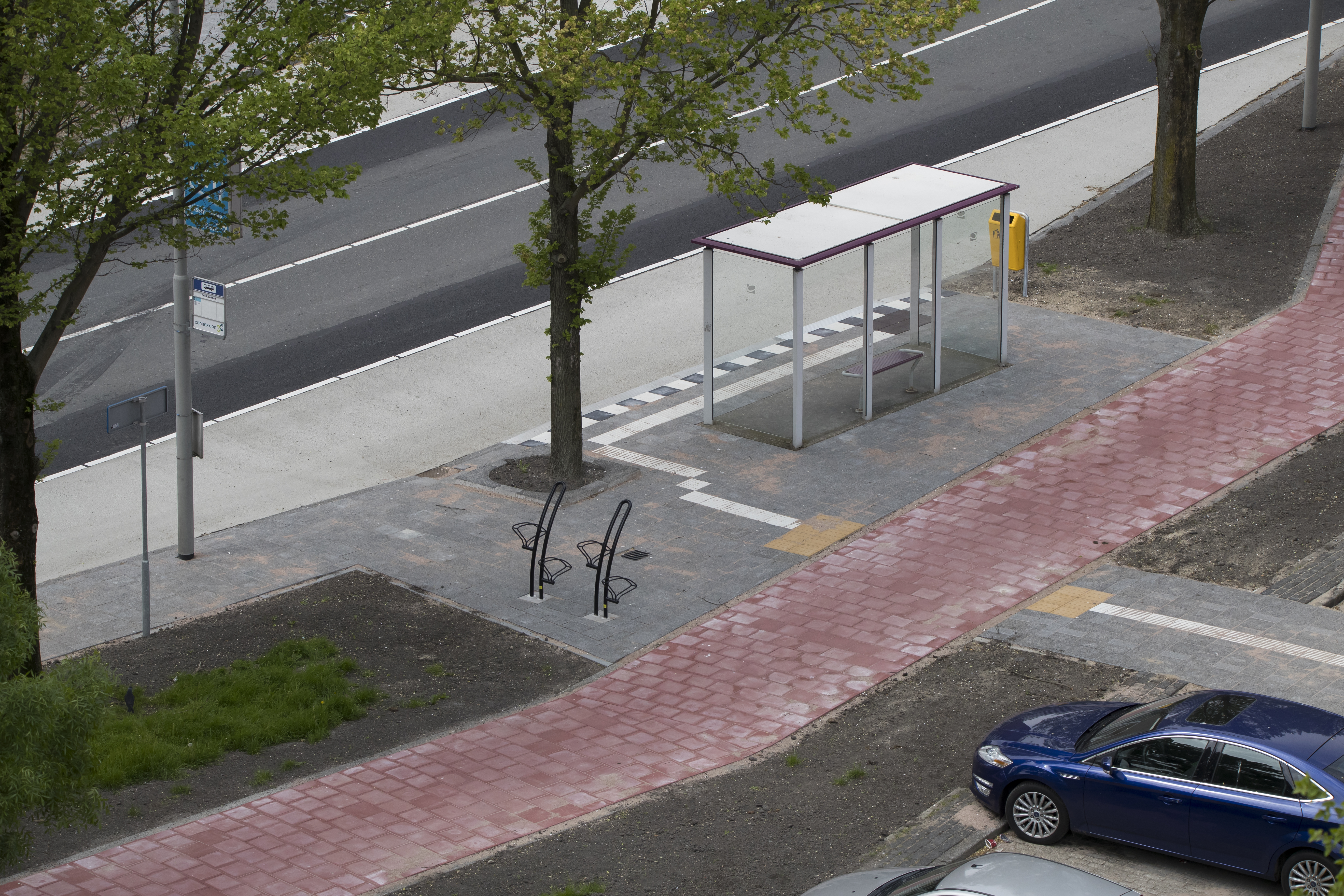 Onlangs zijn aan beide zijden van deze weg verhoogde bushaltes aangelegd met een bushokje. Na de oplevering zien ze er zo uit: