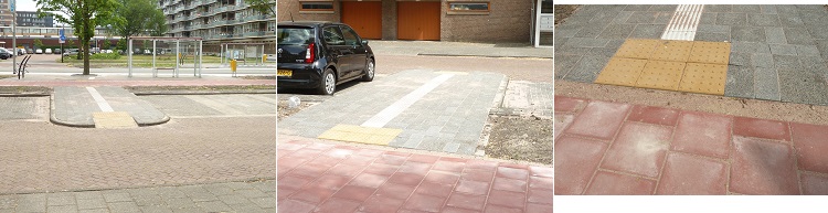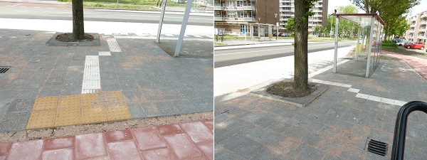 Voor degenen die een visuele beperking hebben (blinden en slechtzienden) zijn er ook maatregelen getroffen. Je ziet op de foto hierboven en hieronder hoe het aan de trottoirzijde is geregeld en op de foto's hieronder hoe dat aan de haltezijde is gedaan.
