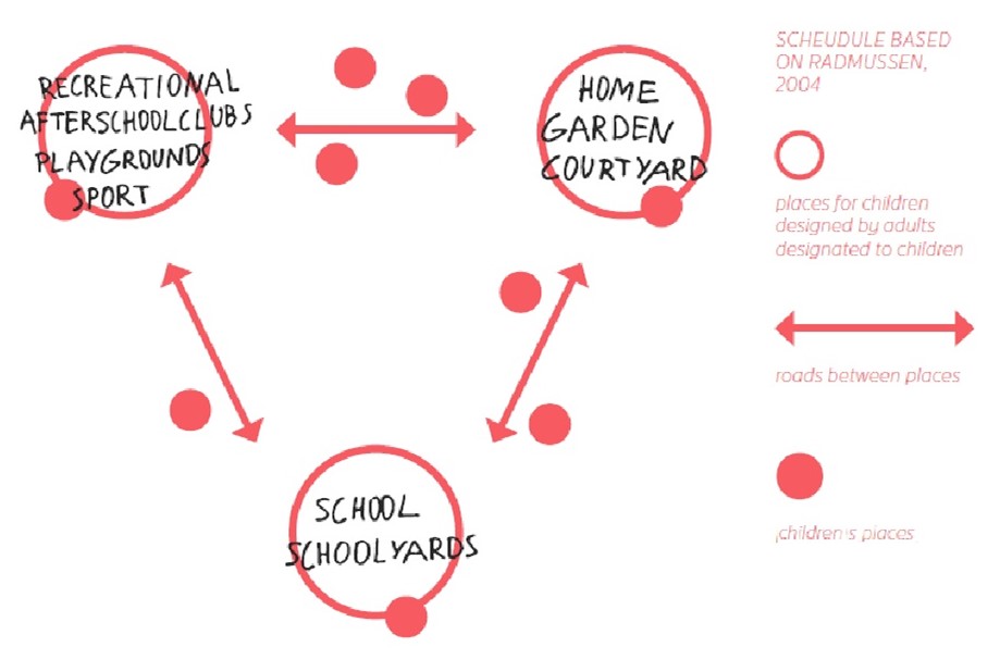 In een buurt-rondleiding, buurtanalyse door kinderen, of door een fotodialoog, leer je waar pas echt waar kinderen sowieso wel/ niet samenkomen en waarom. Kunnen we die plekken verbeteren zodat meer kinderen daar vaker, met meer plezier en dus ook langer zullen spelen? Bij de goeie vragen, geven kinderen geweldige stedenbouwkundige inzichten. Schoolpleinen zijn een plek waar kinderen sowieso al veel samen zijn (peers) en vaak vanzelf wat langer mogen blijven spelen na school (permission): twee P’s in één keer dus.