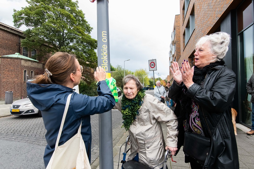 De route, Blokkie Om genaamd, bestaat uit twee delen die worden doorkruist door de Burgemeester Baumannlaan. Het ene deel is de gele route, de andere route is groen. Van Gink: “In het ontwerp waren op ooghoogte gekleurde stickers op lichtmasten geplakt. Nu heb ik, ook om in contact te komen met de doelgroep in de buurt, tijdens ouderencafés sjaaltjes gebreid. Deze gele en groene sjaaltjes hebben we speciaal voor de opening om de lichtmasten gedaan. De ouderen waren ook bij de opening aanwezig, wat bijdraagt aan het gebruik en de bekendheid van de route.” Na de opening maakten de sjaaltjes plaats voor gekleurde banden.