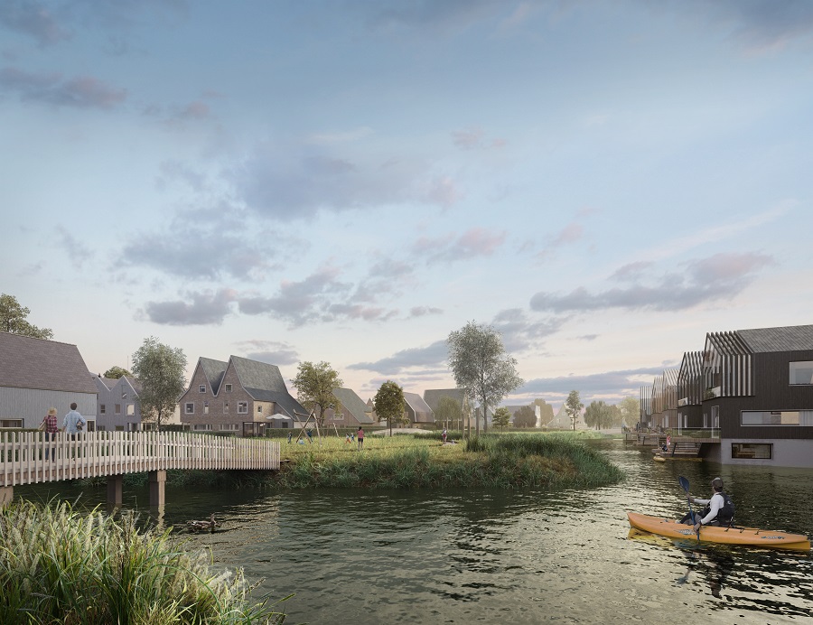 “We hebben een tender gedaan met gebiedsontwikkelaar AM voor een waterrijke en energieneutrale woonwijk in Krommenie, samen met onder andere Flux landscape architecture. Op de locatie waren voorheen sportverenigingen gehuisvest. Het dorp ligt nu met de rug naar het landschap. Het was als het ware de achterkant van het dorp. Wij vonden het van begin af aan belangrijk om de aangrenzende natuurgebieden in verbinding te brengen met de nieuwe woonwijk en Krommenie door het landschap met zijn waterstructuren en rietoevers door te trekken tot in de nieuwe wijk.”