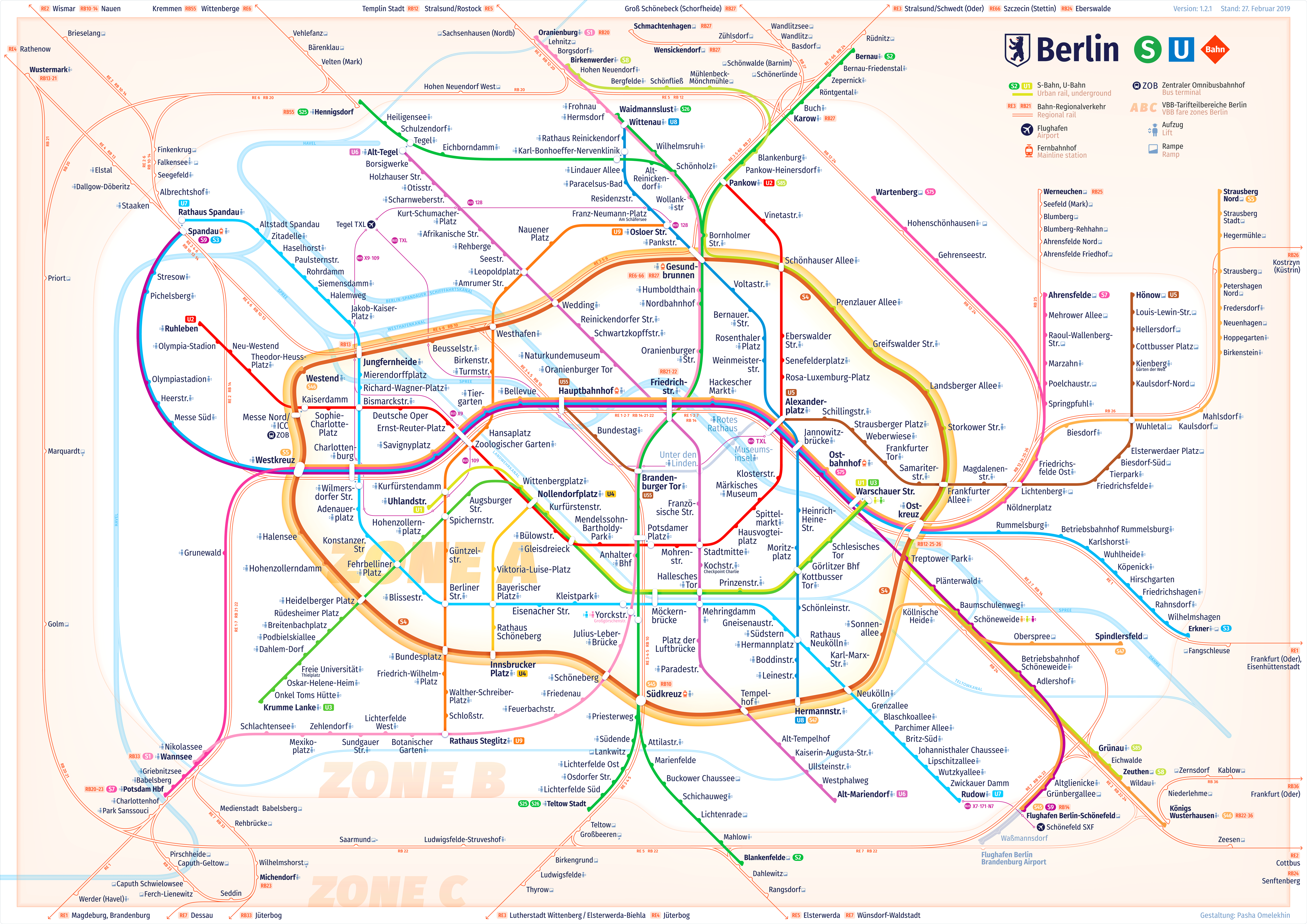 De Russische cartograaf Pasha Omelekhin ontwikkelde een nieuwe metrokaart van Berlijn, omdat de oude moeilijk leesbaar zou zijn. De officiële metrokaart van Berlijn stamt uit 1992 en is daarmee behoorlijk verouderd. Zo heeft Berlijn de afgelopen 27 jaar een boel nieuwe metrohaltes gekregen en is de vormgeving ook uit de tijd, zegt Omelekhin. Daarom is het volgens hem tijd voor een nieuw ontwerp, dat zich kenmerkt door vloeiende lijnen die meer overzicht bieden. Ook is de informatie is beter verdeeld, waardoor de kaart makkelijker te lezen is.