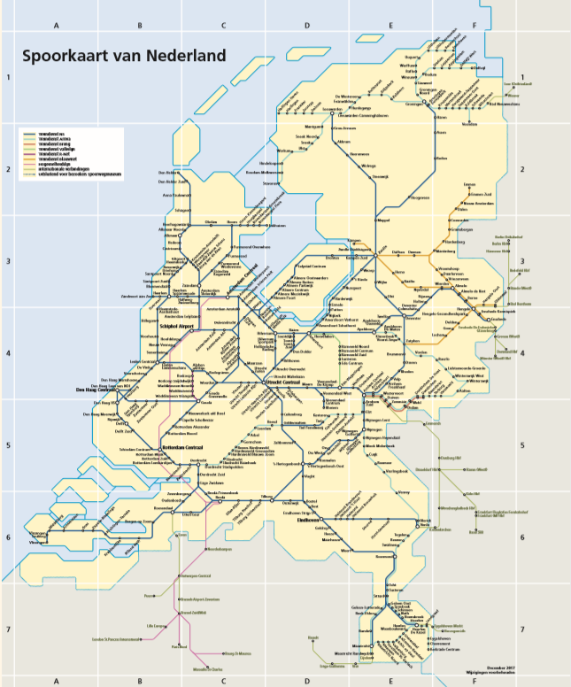 Daarbij tellen ook een rustig kleurgebruik en een goed leesbaar lettertype, dat zoveel mogelijk in dezelfde richting geschreven wordt. In de NS-Spoorkaart zijn alleen de contouren van Nederland zichtbaar, herkenbaar aan bijvoorbeeld de Waddeneilanden en Zeeland. “In de Randstad zijn meer stations dan in de buitengebieden en is het drukker, dus dat gebied is op de kaart meer opgeblazen", zegt Pruis.