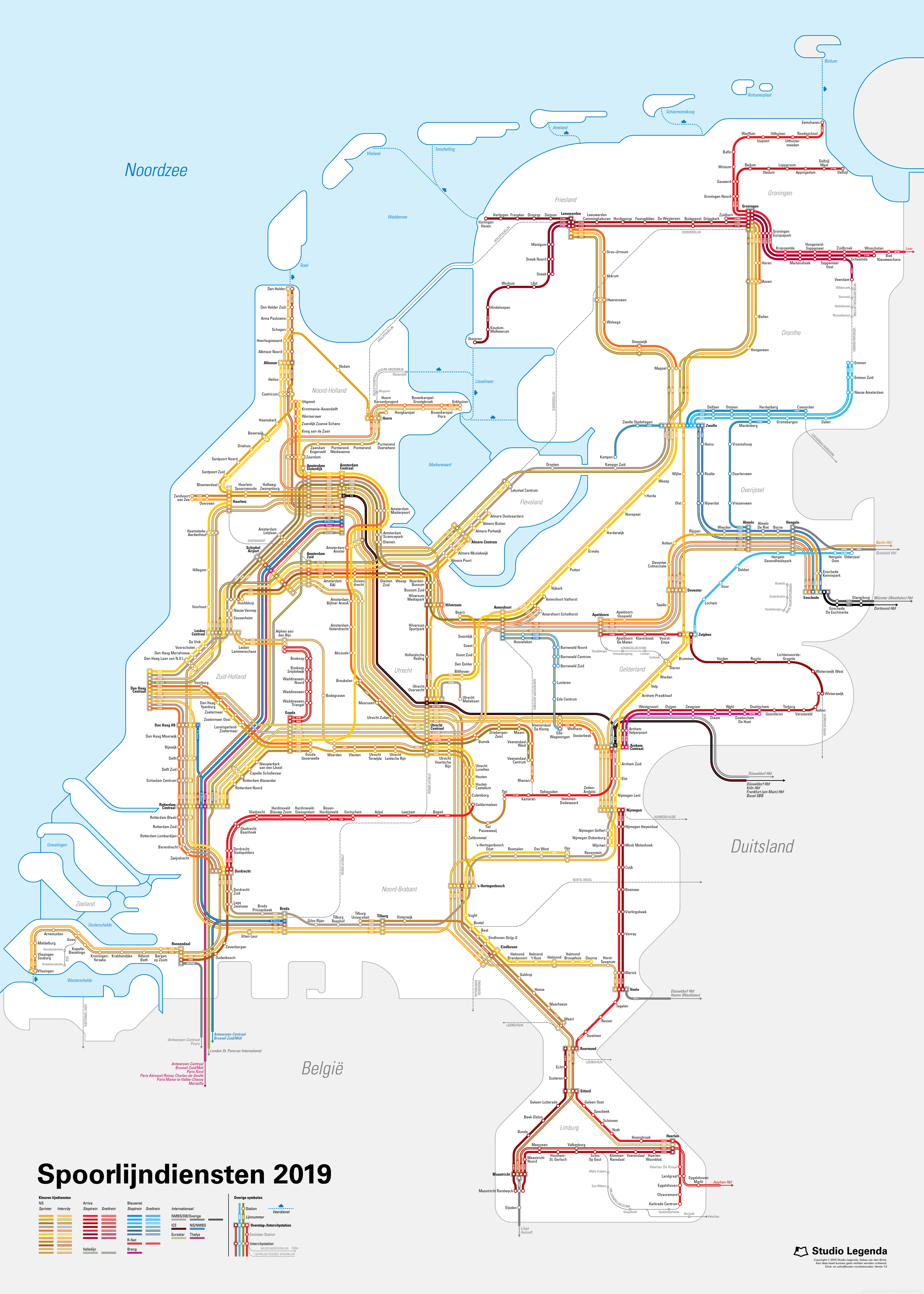 “En kill your darlings”, reageert Van den Brink. Hij realiseerde recent een eigen spoorkaart, nadat hij eind 2017 ook al een snelwegkaart van Nederland uitbracht, waarin de informatie in ‘metrovorm’ wordt gepresenteerd. “Des te meer informatie je weergeeft, des te lastiger het leesbaar wordt. Je moet dus kiezen welke informatie je wel en niet presenteert.”