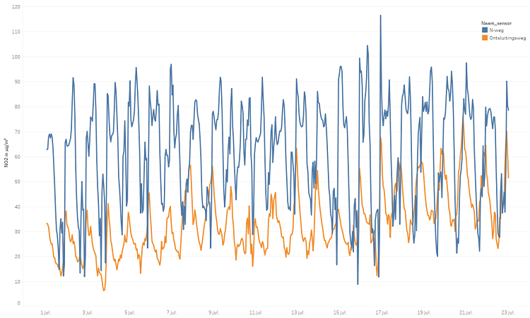 Aangezien er meer verkeer op de N270 rijdt, is het te verwachten dat de NO2-waarden het hoogste zijn langs de N270. Bij de kruising De Voort en de Biezenlaan is ook gemeten. Daar zijn de NO2-waarden aanzienlijk lager, zoals in onderstaande afbeelding te zien is.