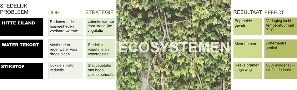 De keuze van soort en type groen is volgens deze strategie niet meer alleen afhankelijk van esthetische factoren of restruimtes. De strategie is juist omgekeerd: er is een hoeveelheid groen van een bepaalde soort en type nodig voor het oplossen van een probleem, dus dient er ruimte voor gereserveerd te worden in het ontwerp. Net zoals isolatiemateriaal en gevelbekleding berekend en ontworpen wordt voor een bepaald energiedoel, wordt een ecosysteem berekend en ontworpen voor een bepaald klimaatdoel.