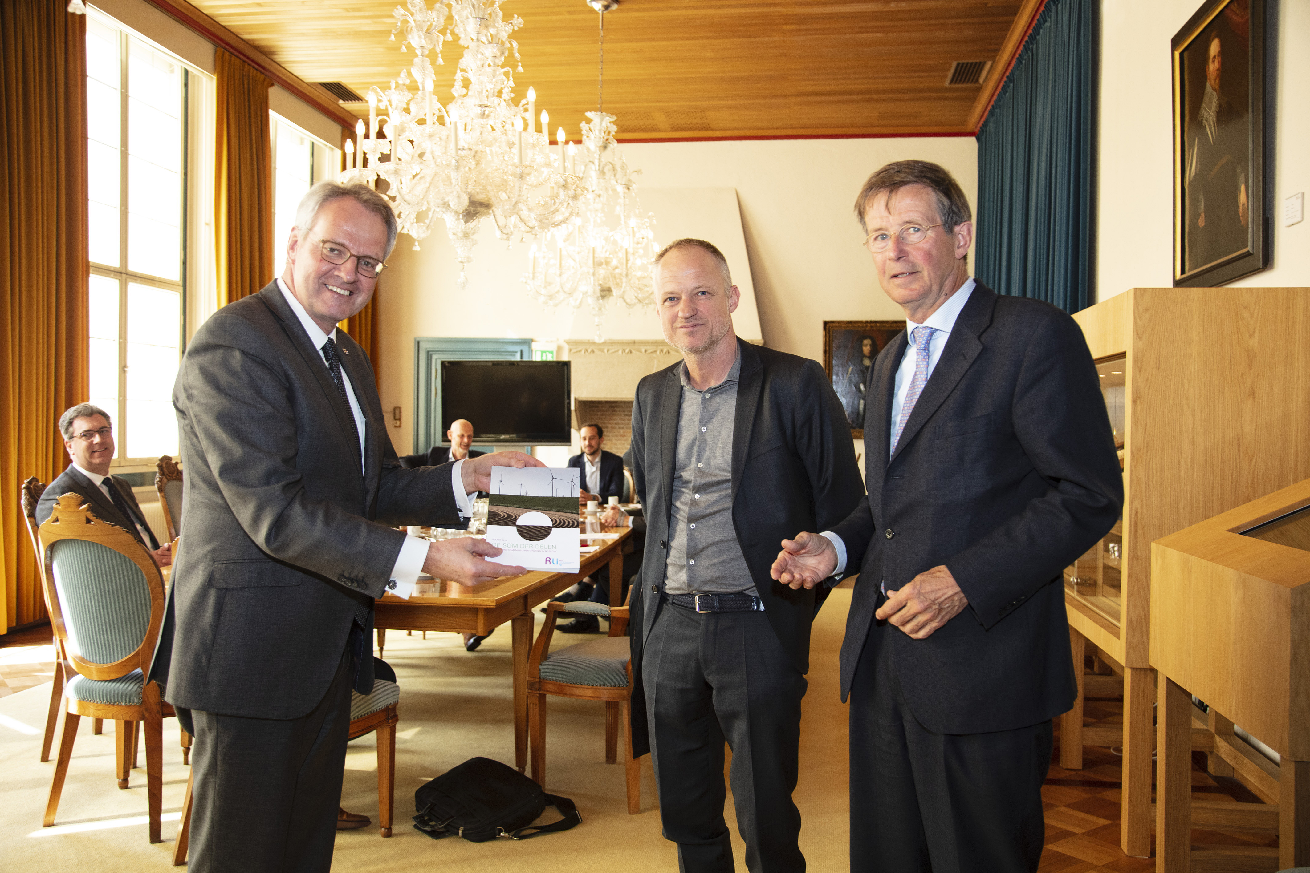 Commissaris van de koning van provincie Zeeland, Han Polman (l), neemt de verkenning in ontvangst met Co Verdaas (m) raadslid, en Jan Jaap de Graeff (r), voorzitter Rli. Foto: Mark Neelemans