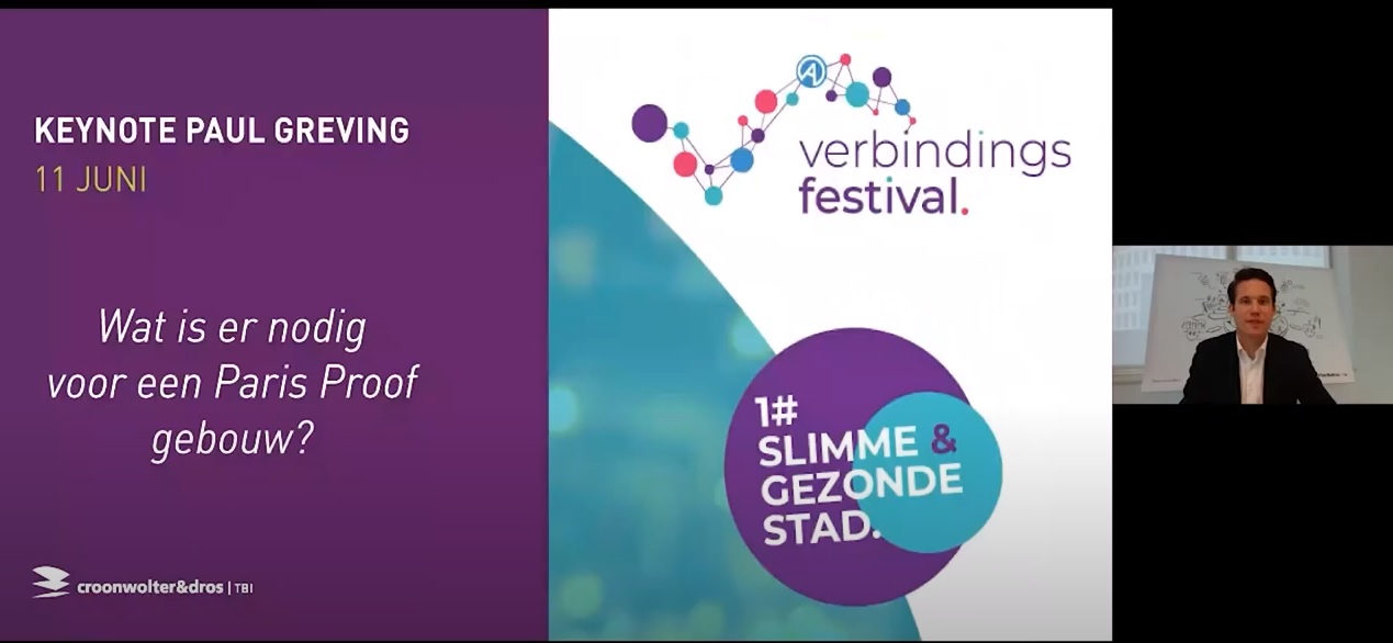 Paul Greving verzorgde tijdens het Verbindingsfestival namens hoofdsponsor CroonWolter&Dros een van de keynotes op het main stage. Onderwerp was het Paris Proof gebouw. Want om tot een slimme en gezonde stad te komen (het hoofdthema van het festival) is het belangrijk om te werken aan de klimaatdoelen die in 2015 in Parijs werden gesteld. Dat betekent onder meer dat het energieverbruik in gebouwen fors omlaag moet. Paul Greving liet zien hoe je dat voor elkaar krijgt, bekijk hieronder zijn keynote.